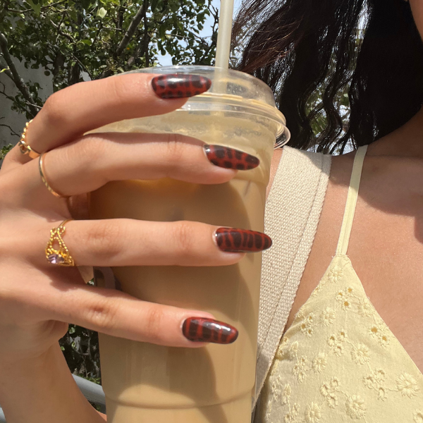 A snakeskin-inspired manicure featuring a rich brown-red pattern repeated across the nails.