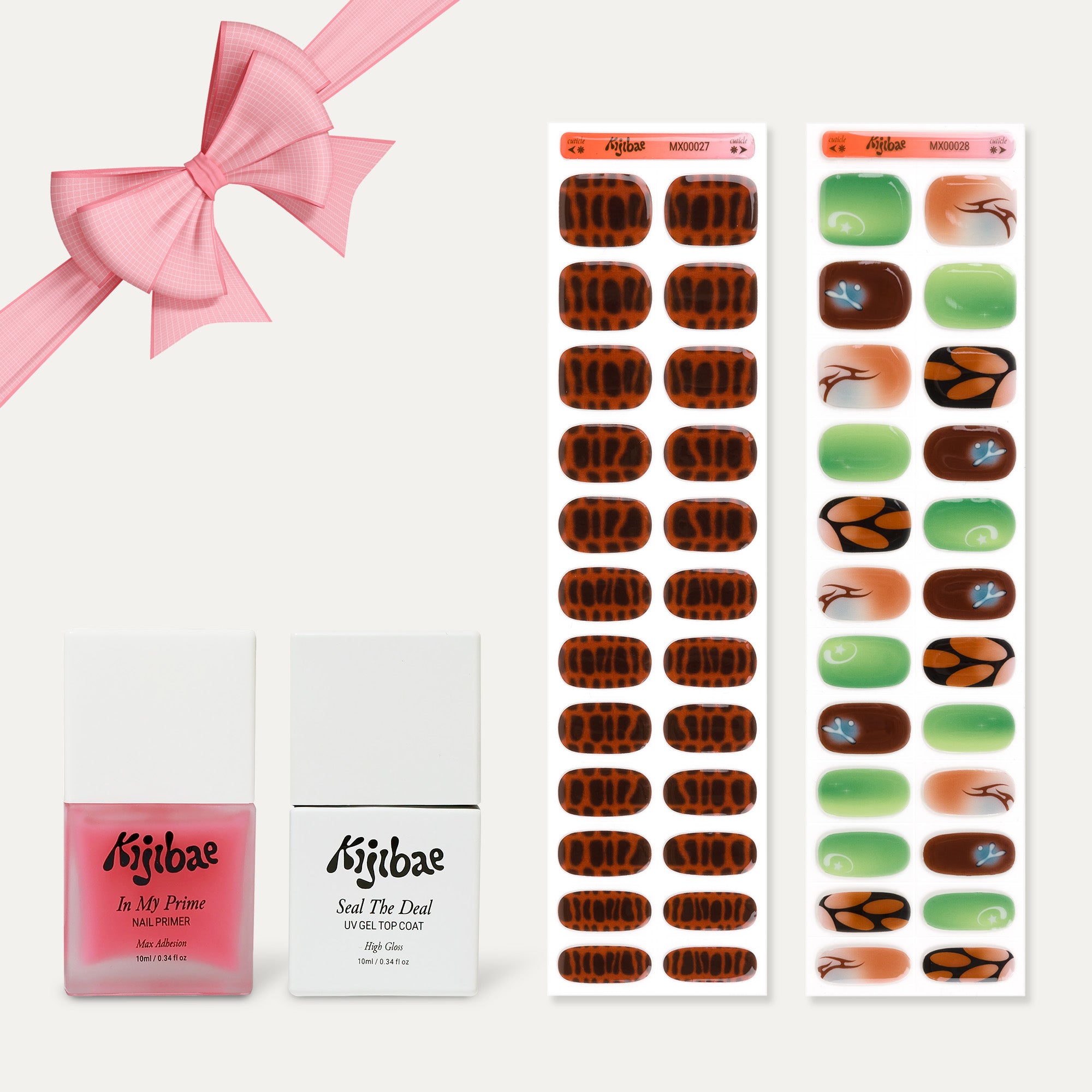This all-in-one bundle includes two nail strip sets (So Mother + Snake's Out), In My Prime Primer to set the stage for perfection, and Seal The Deal UV Gel Top Coat to lock in your masterpiece with a glossy finish.