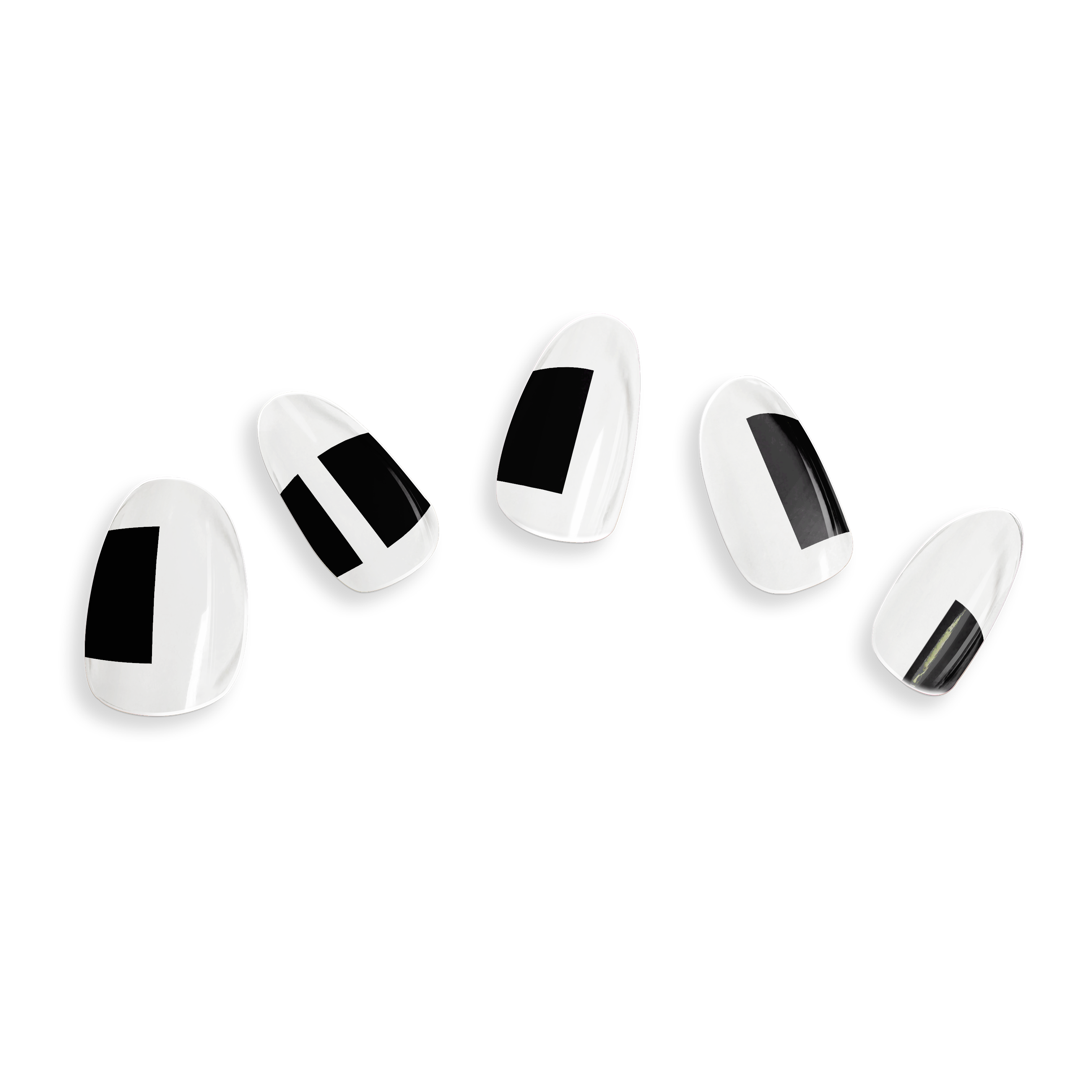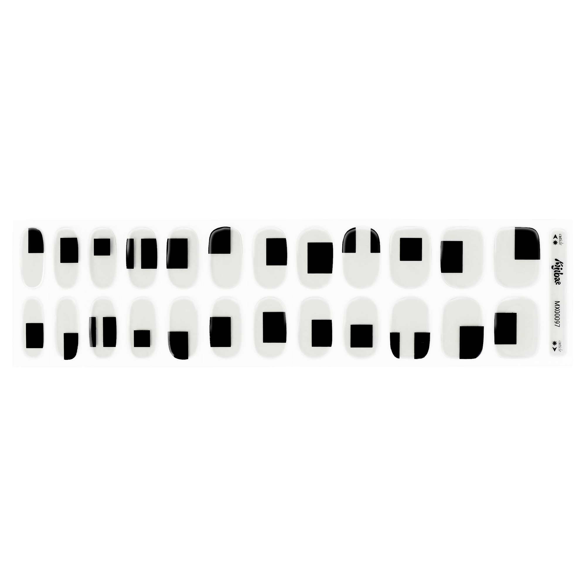 An abstract manicure with black box details positioned uniquely on each nail over a clear base.