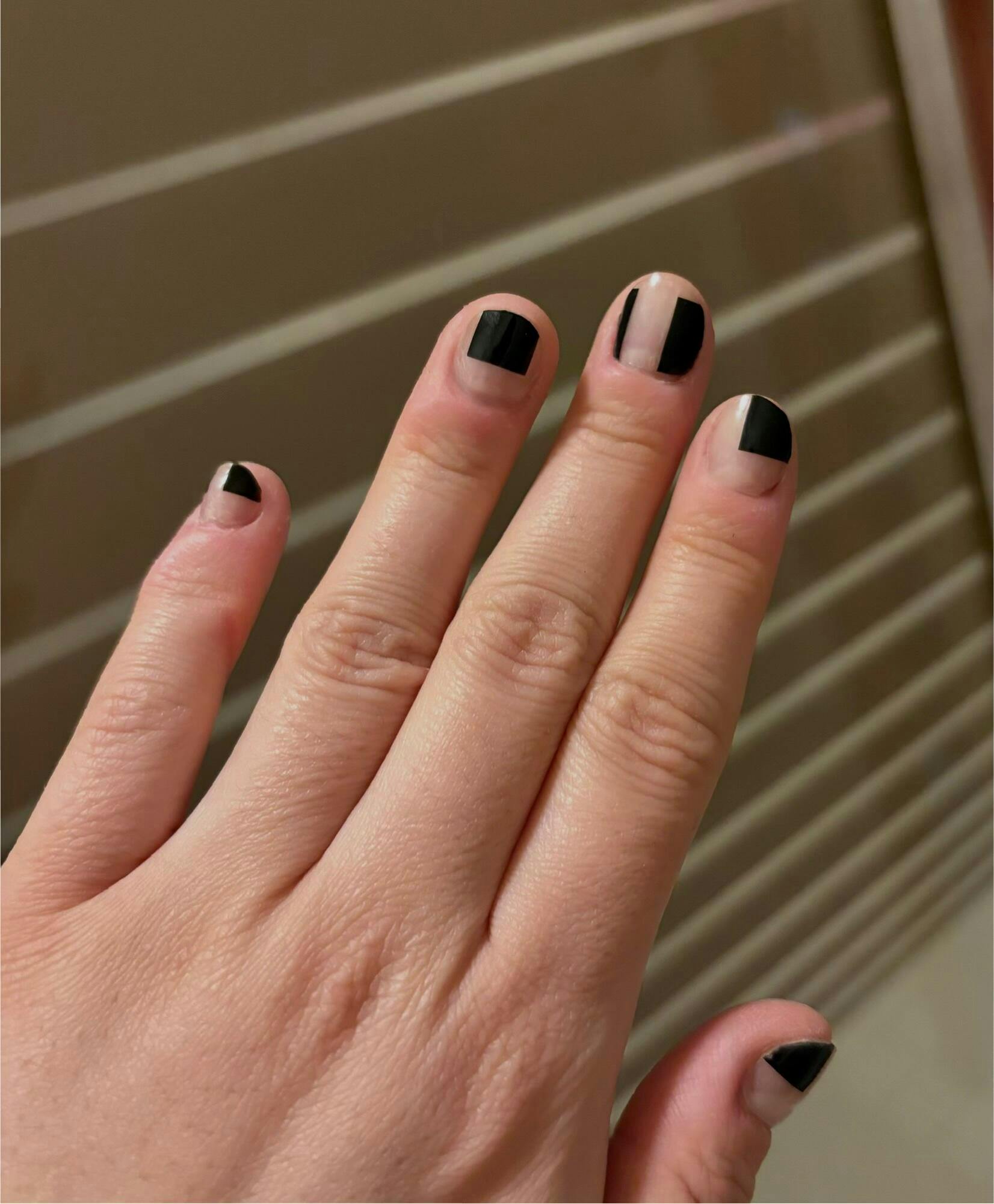 An abstract manicure with black box details positioned uniquely on each nail over a clear base.