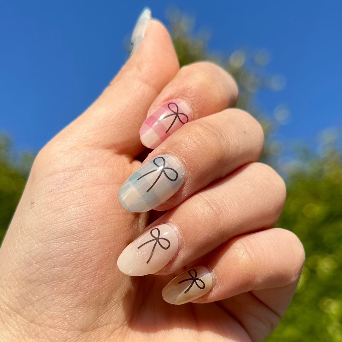 A multi-colored gingham manicure featuring blue, pink, and light pink on a creamy white base, accented with an outward-facing black ribbon.