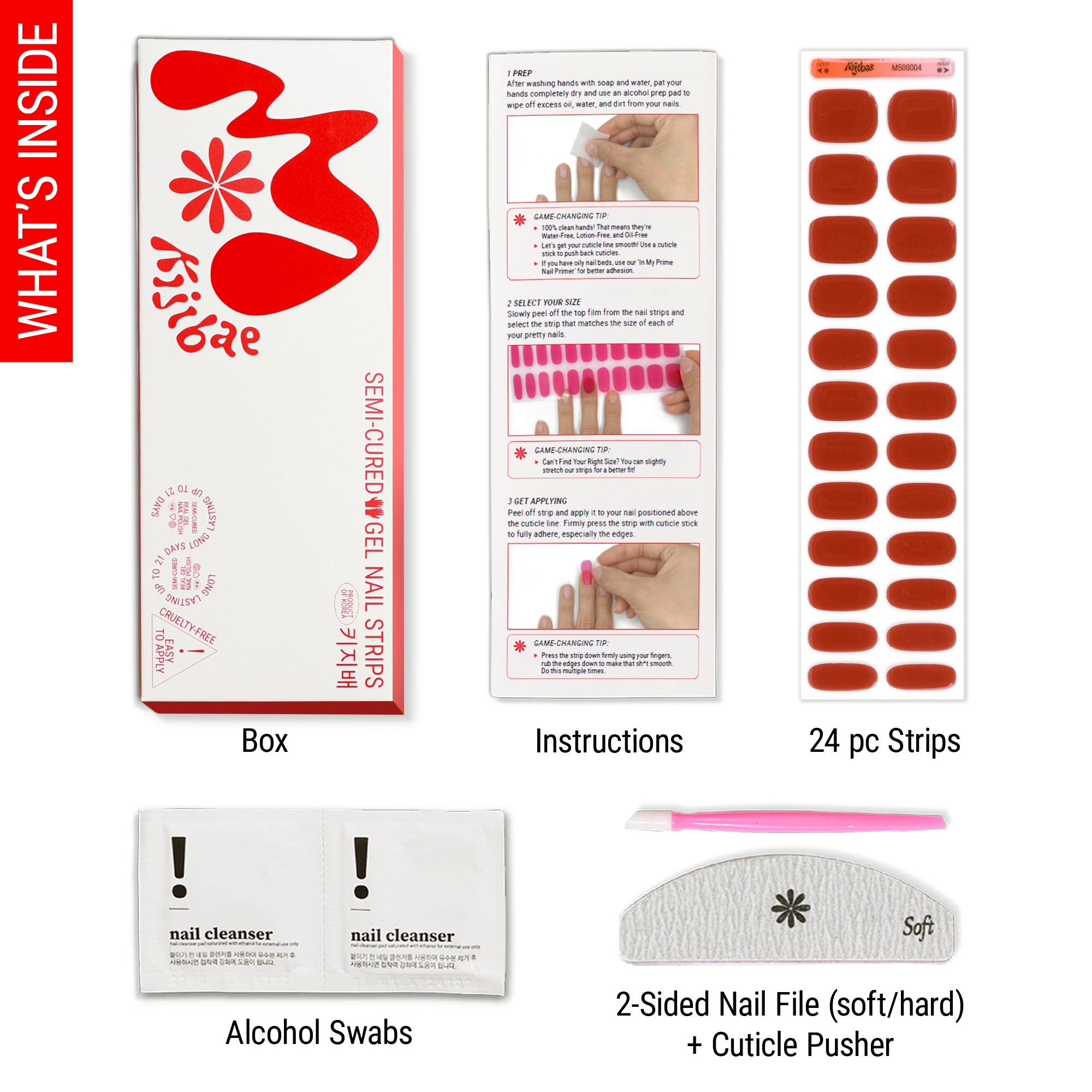 - Includes 24 strips, nail file, cuticle stick, 2 alcohol pads