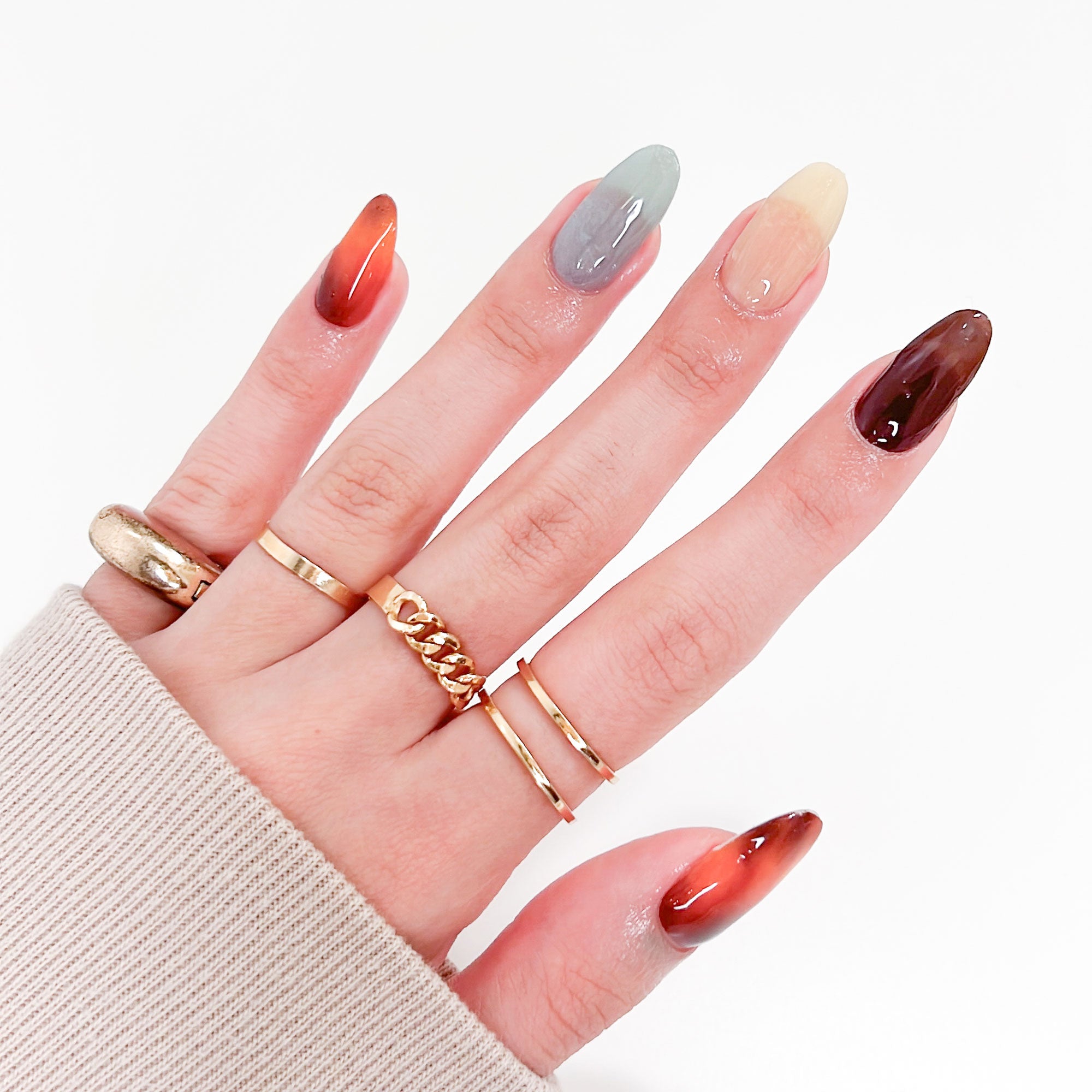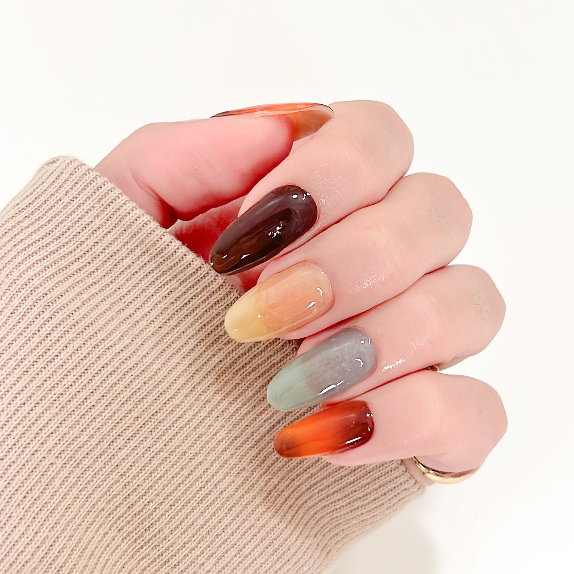 A fall-inspired mix and match manicure featuring deep brown, pale yellow, blue-gray, and tortoiseshell bases for an effortlessly chic, elevated look.