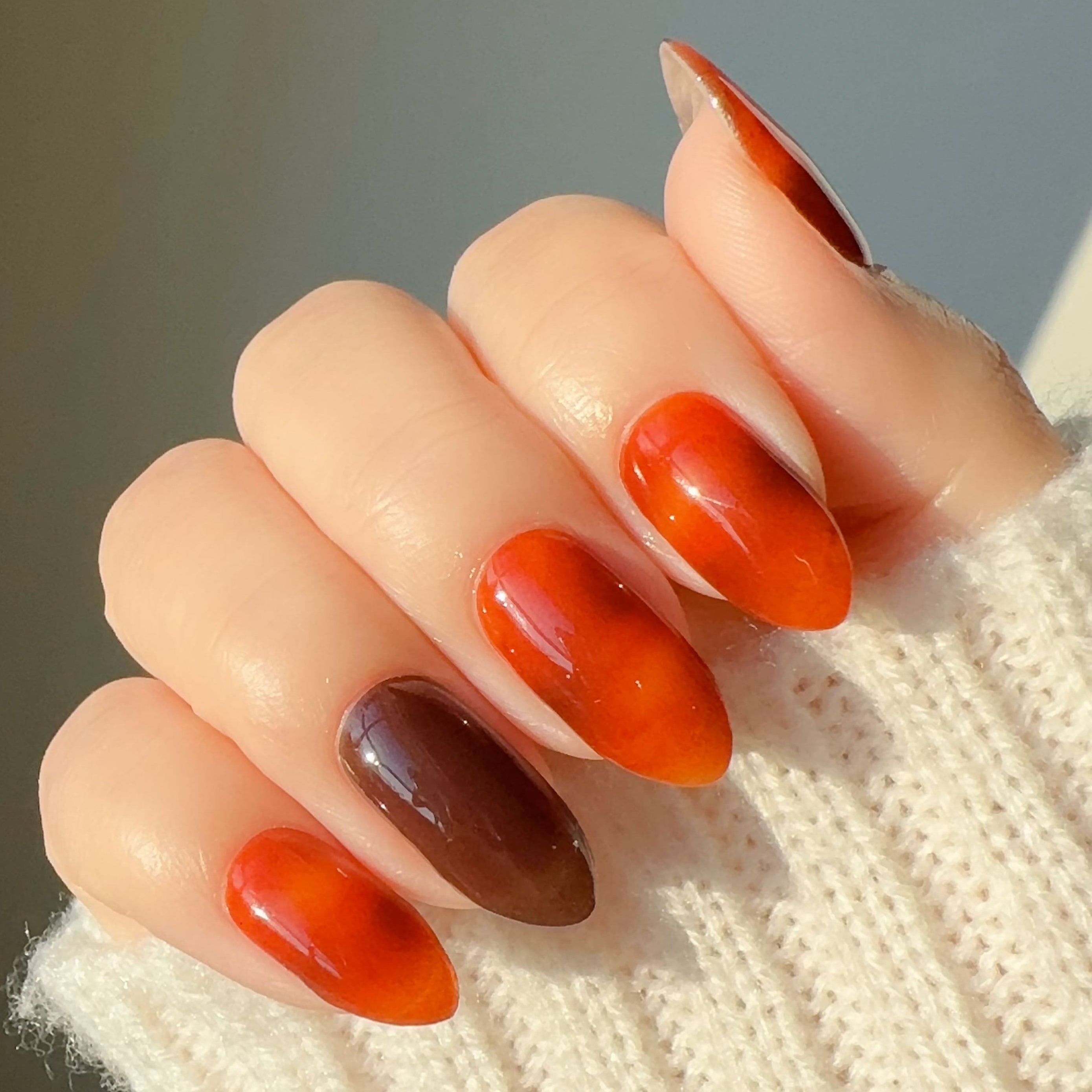 A warm-toned manicure with red-orange marbled designs and paired with a solid coffee brown base, creating a sophisticated mix and match look.