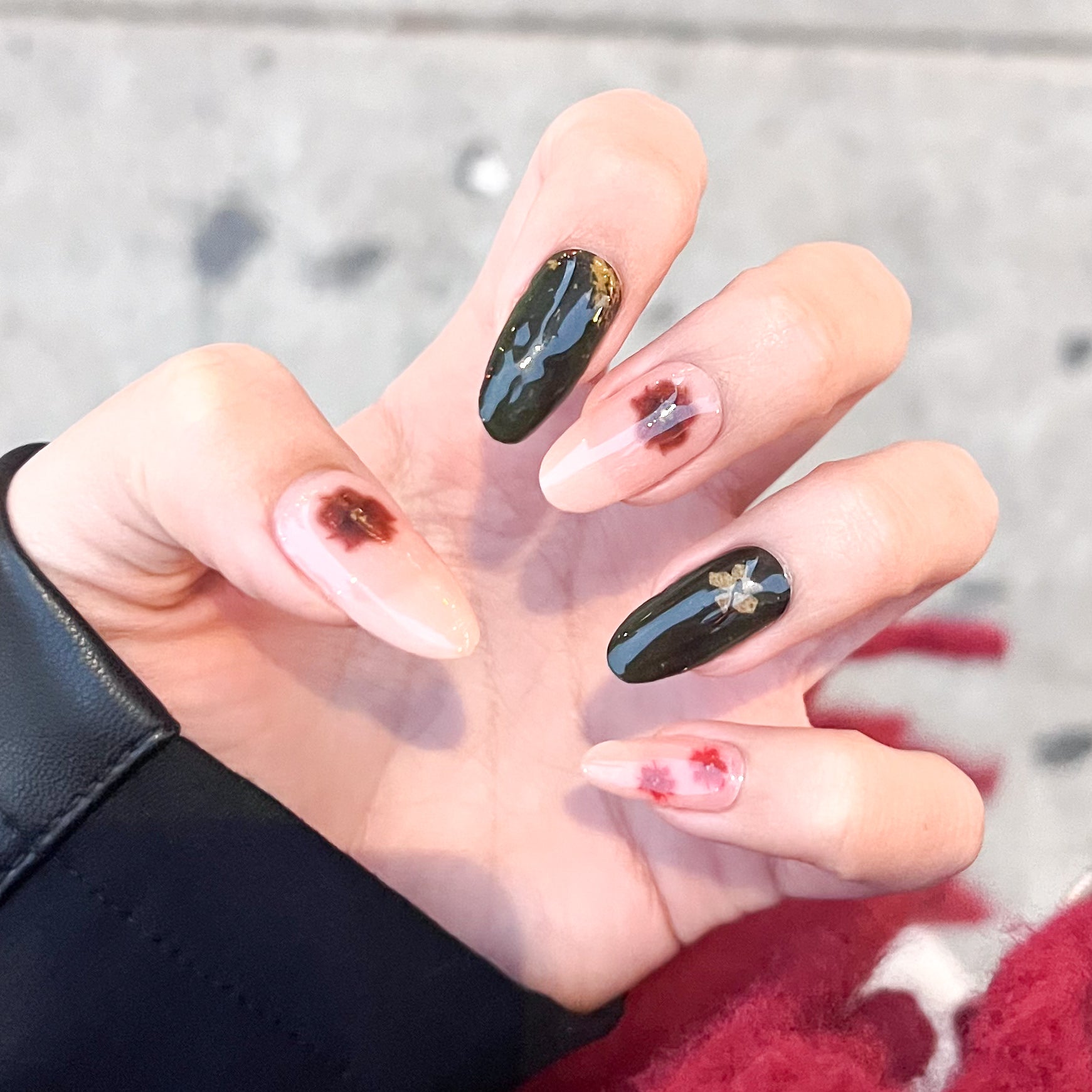 A jaded marble–inspired manicure featuring a jade-toned base with gold accents at the nail base, complemented by plum red and purple blooming flowers over a soft baby pink nude base for an elegant and classy look.