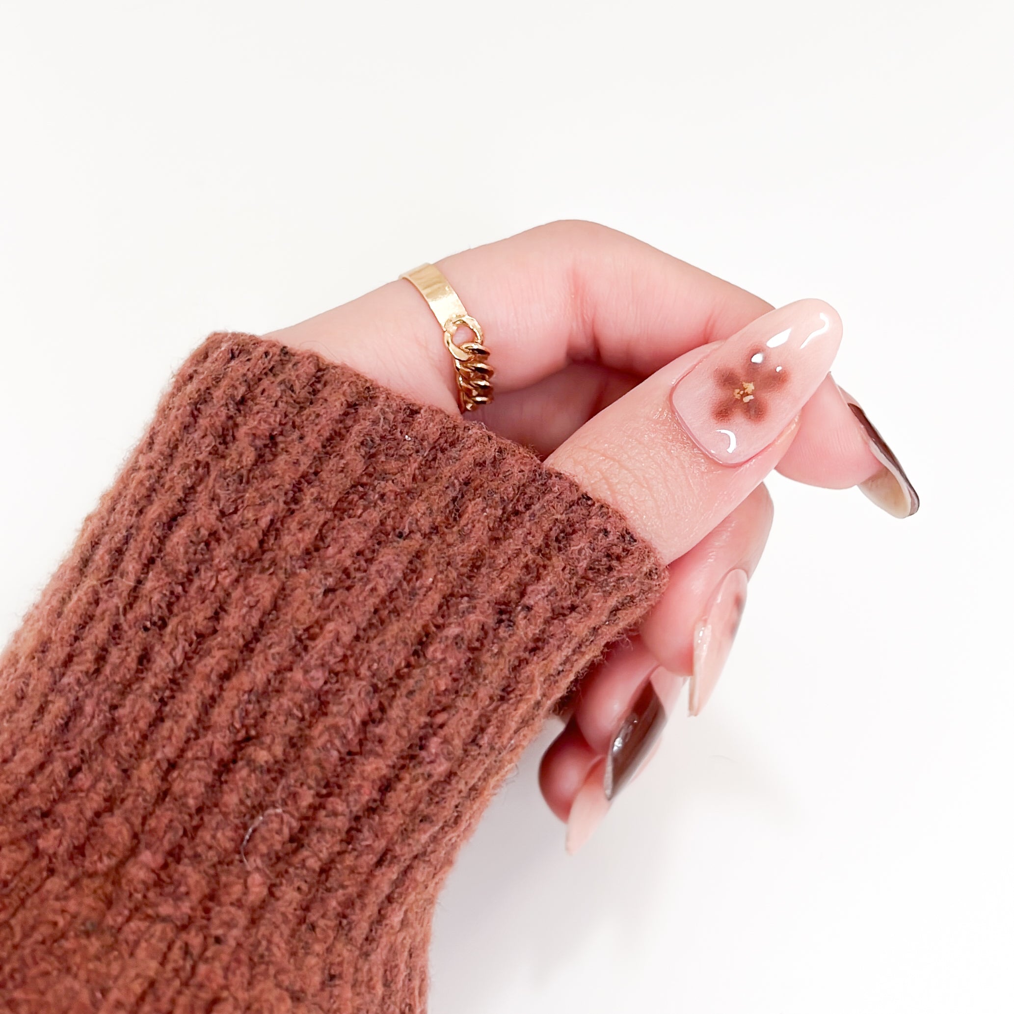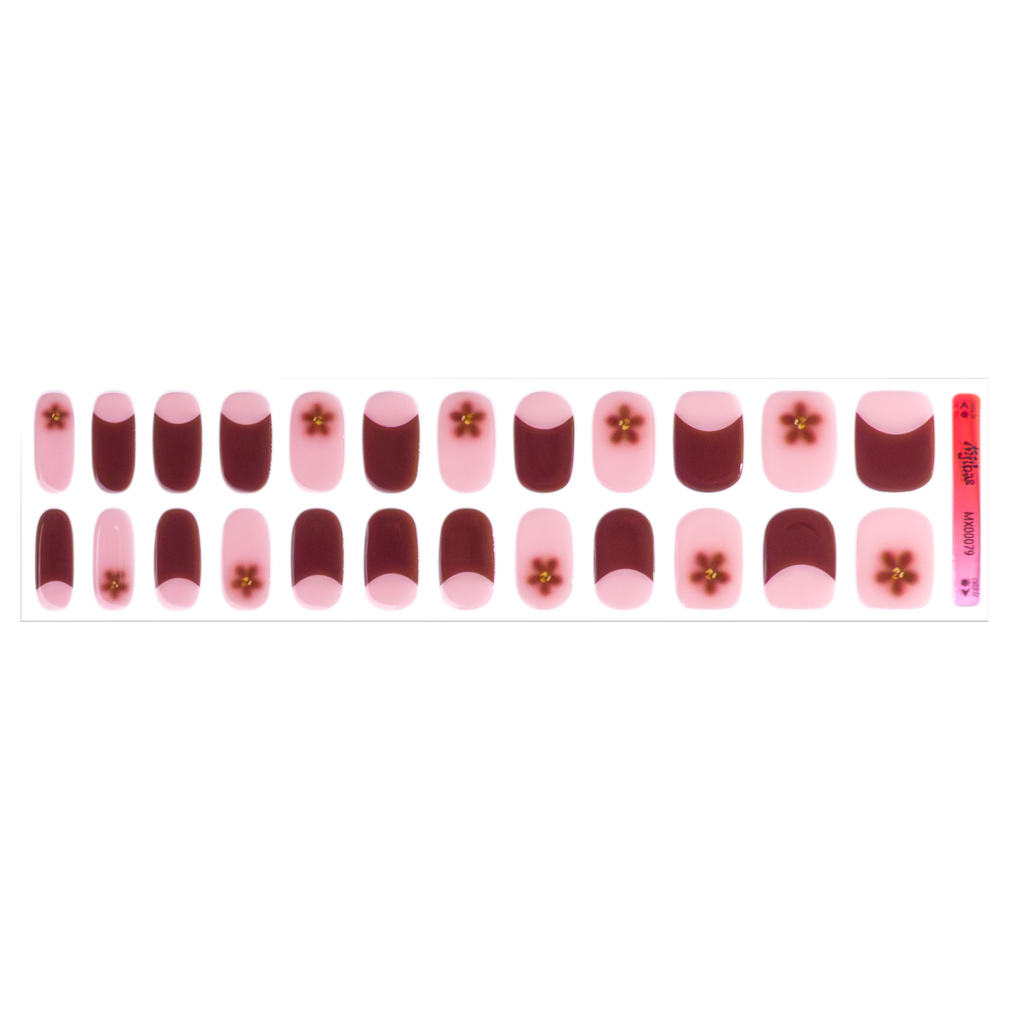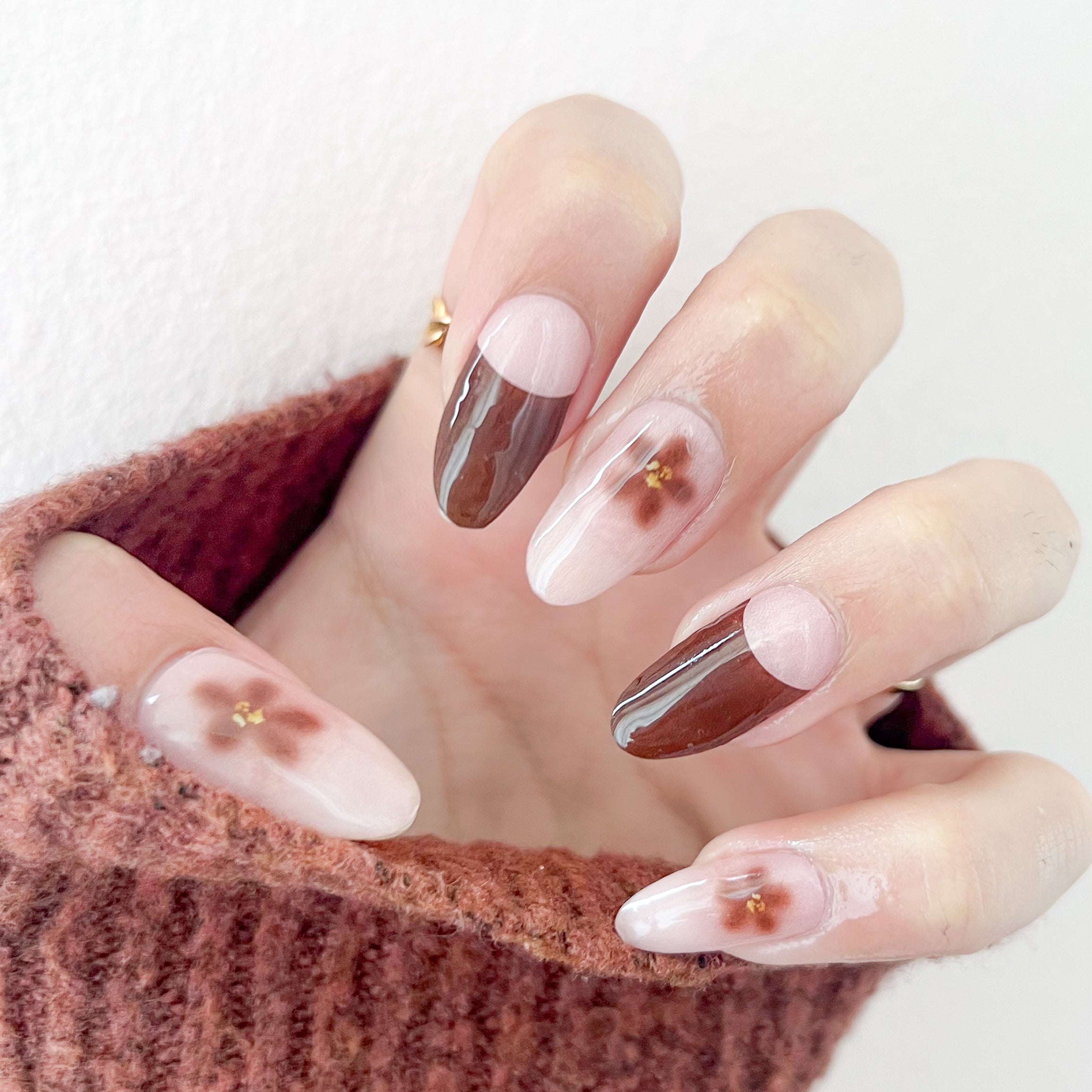 A deep chocolate brown–inspired deep french manicure featuring classic french tips and brown blooming flowers with gold accents at the center, set over a pink nude base for a clean and fall ready look.