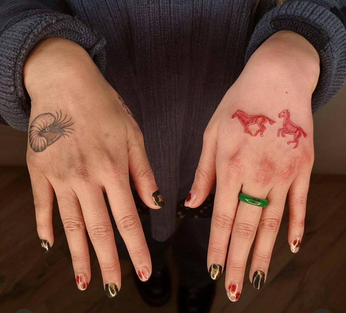 i got these to have my hands looking extra pretty for my new hand tats, and these nails did not disappoint!! they are truly so pretty, & i also love that they are so customizable length-wise. first set stayed on for 2.5 weeks, and the second ~2 weeks! (pic is me with the tats, shout out to abril @1nklingchica on insta)