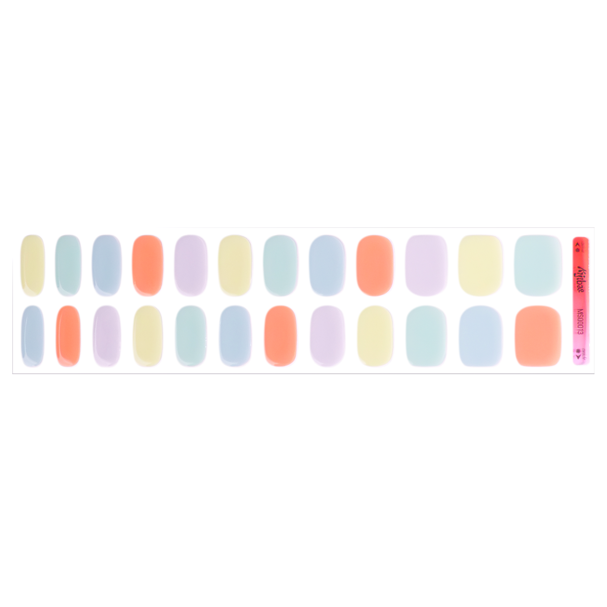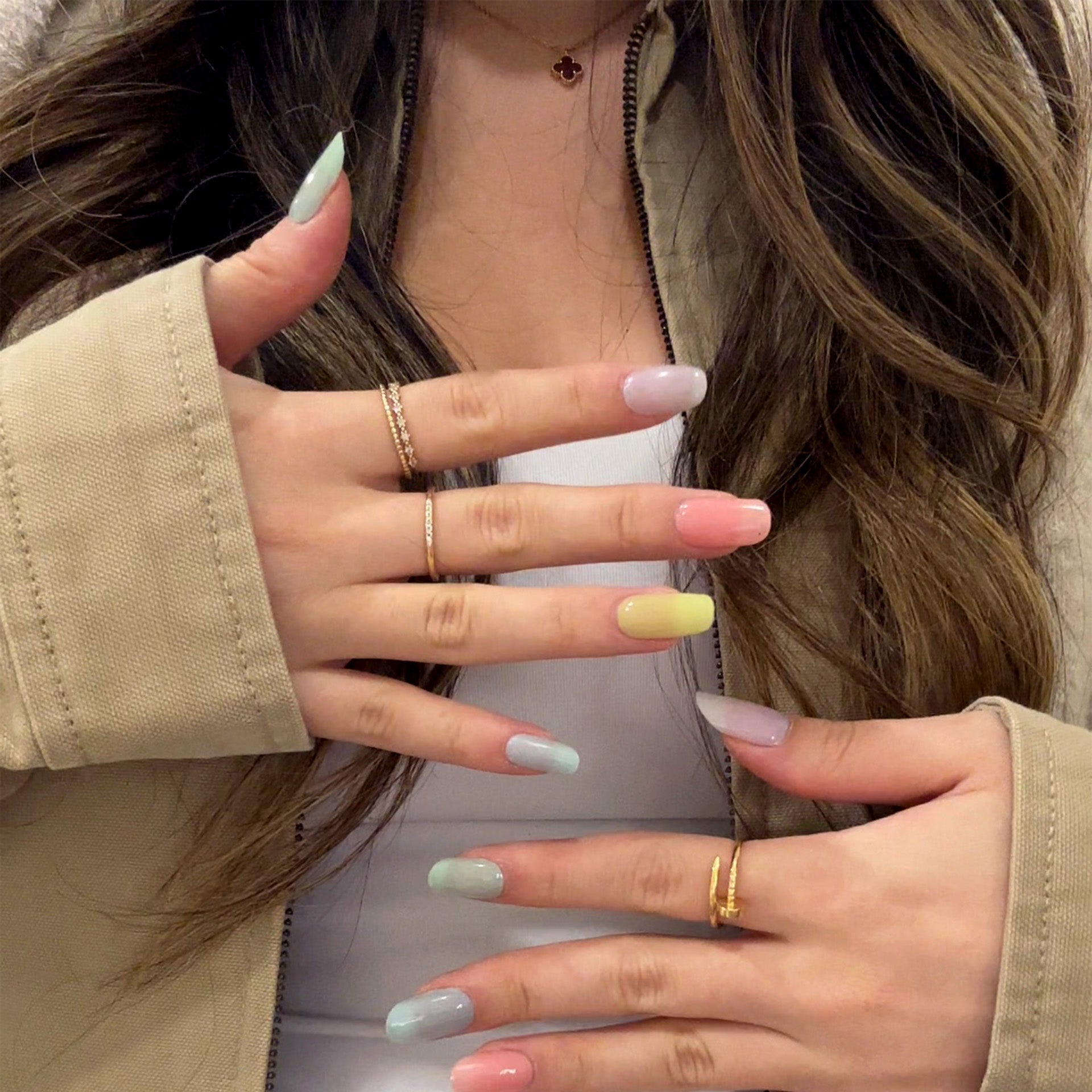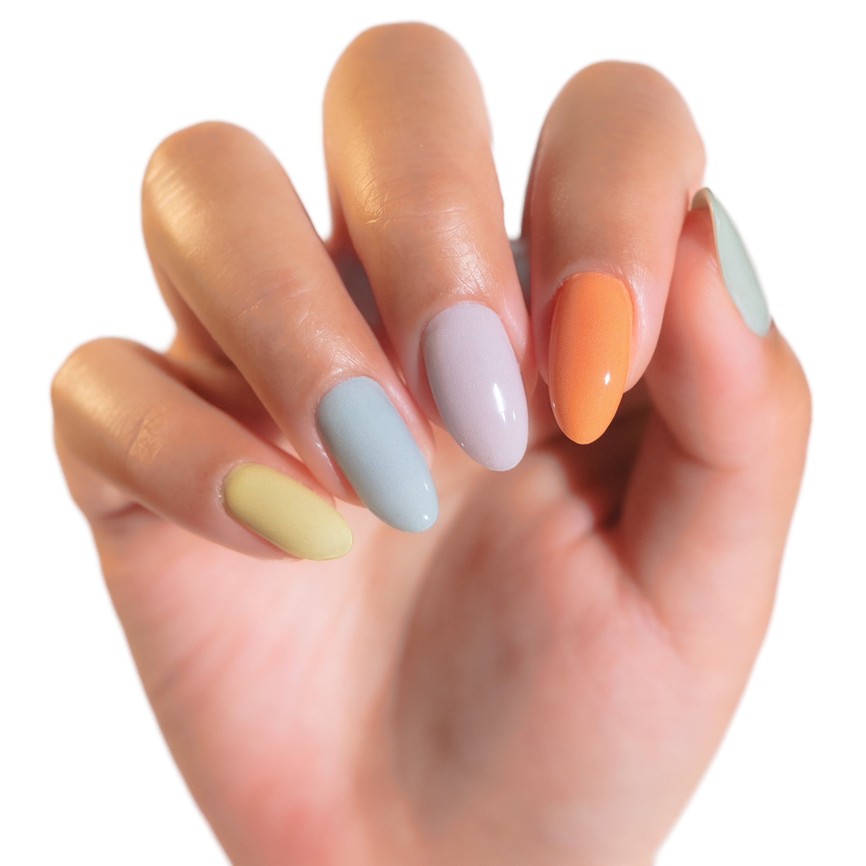 A soft pastel manicure featuring an array of pink, blue, green, purple, and teal tones for a fresh, playful look.